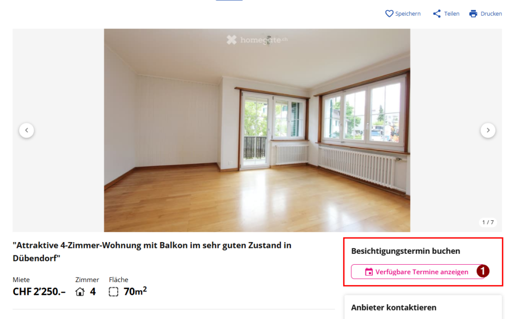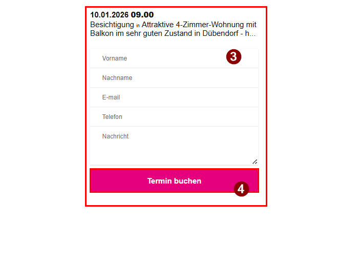 Besichtigungen finden für alle Wohnungen wie folgt statt: 28.01.2026 16:00-18:00 Uhr 31.01.2026 09:00-11:00 Uhr 10.01.2026 09:00-11:00 Uhr 14.01.2026 18:00-20:00 Uhr Bitte melden Sie sich für die Besichtigung direkt beim Inserat bei Flatfox an 4-Zimmer Wohnung EG 2-Zimmer Wohnung DG Status der nächsten Besichtigung: Findet statt! Kurzanleitung: Bitte aktiviere JavaScript in deinem Browser, um dieses Formular fertigzustellen.Name *VornameNachnameAdresse *Hausnummer *PLZ *Ort An Sie Hausnummer Email *Telefonnummer *An welchem Datum möchten Sie die Wohnung besichtigen? *08.01.202609.01.202610.01.202614.01.2026Für welche Wohnung interessieren Sie sich? *4-Zi-Wohnung EG4-Zi-Wohnung OG2-Zi-Wohnung DGHaben Sie noch Anliegen?Einreichen